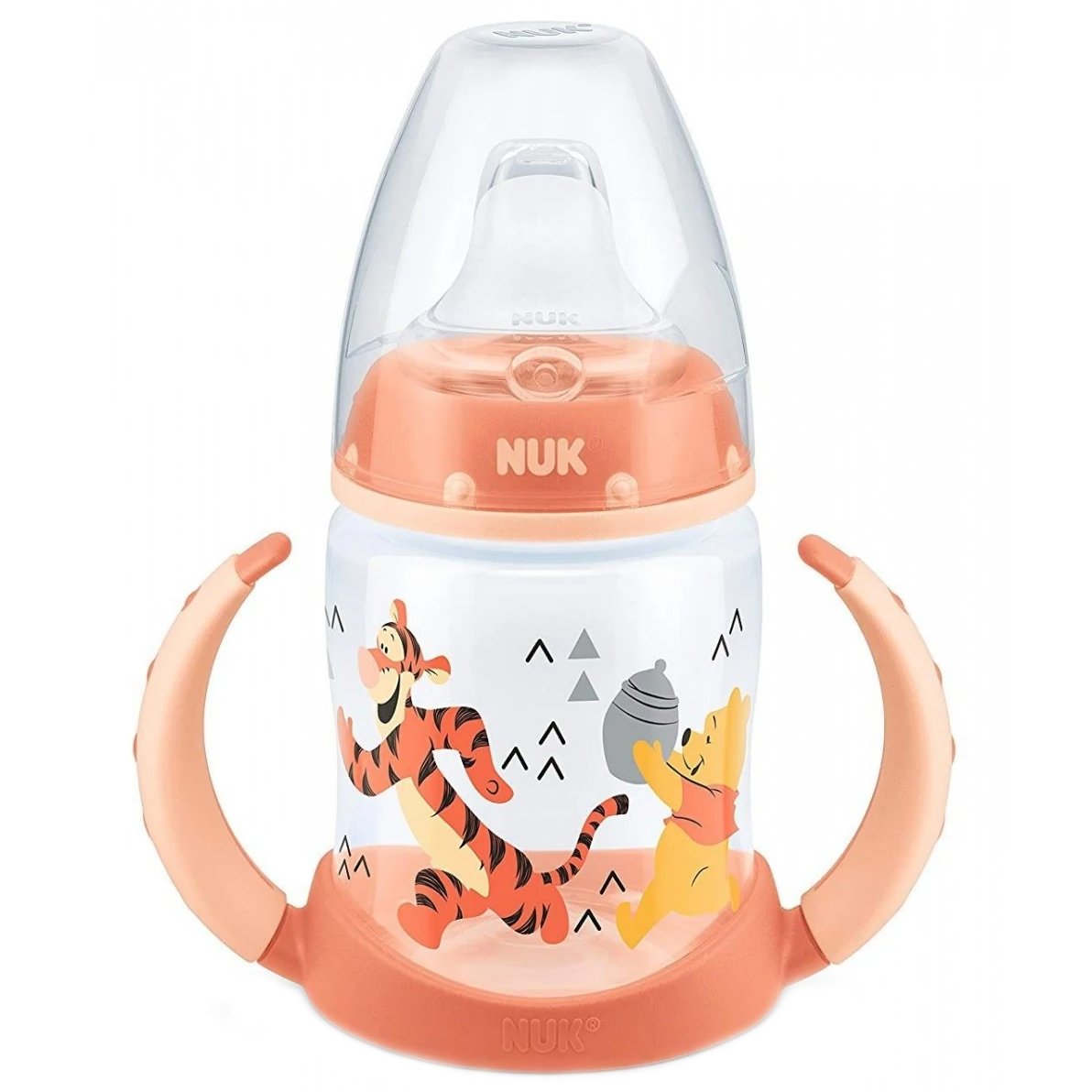 Когато вашето бебе започне да прохожда, шишето First Choice на NUK му помага да премине безпроблемно от кърмене или хранене с шише към самостоятелно използване на шише. Меката силиконова дюза NUK First Choice е приятно мека и не капе. Силиконът е изключително еластичен и мек материал, особено устойчив на високи температури и безвкусен. Не съдържа вредни вещества, устойчив е на кипене, без мирис, прозрачен и с гладка повърхност. Чучурът включва въздушната система на NUK, която компенсира въздушната празнина вътре в бутилката. Това предотвратява коликите и дискомфорта, които се появяват, когато бебето поглъща въздух.